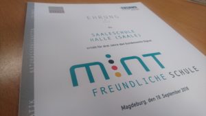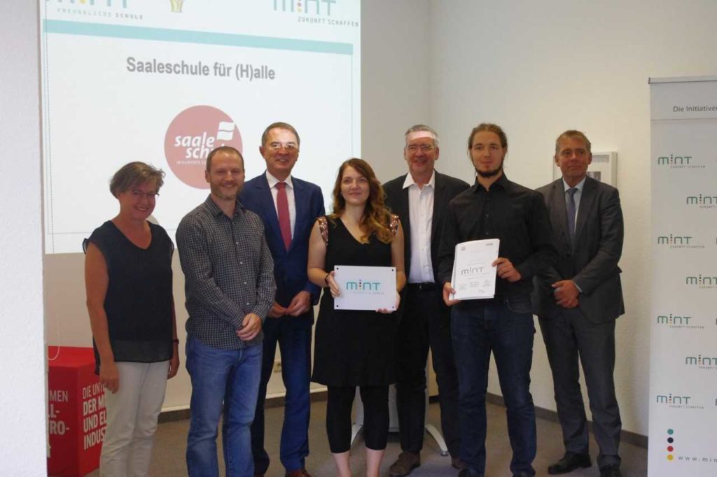 Vor zwei Jahren hat sich an der Saaleschule das MINT-Team gebildet, engagierte Lehrer*innen der Fächer Mathematik, Informatik, Naturwissenschaften und Technik (kurz „MINT“), um in diesen MINT-Fächern enger zusammenzuarbeiten und die Schüler*innen dafür besonders zu begeistern. Als Würdigung dieser Profilbildung im MINT-Bereich wurde die Saaleschule am vergangenen Donnerstag von der Initiative „MINT Zukunft schaffen“ und Bildungsminister Marco Tullner als MINT-freundliche Schule ausgezeichnet. (zur Pressemitteilung)