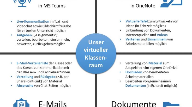 Der zentrale Dreh- und Angelpunkt beim digital-unterstützten häuslichen Lernen bildet „Teams“, eine Cloud-Software von Office365 die auch als App verfügbar ist und so jedes Smartphone zum digitalen Lernbegleiter macht. Bereits am Wochenende nach der Schulschließung wurden 23 virtuelle Klassenräume in Teams eingerichtet, welche die Schüler*innen dann schon ab Montag, dem 16. März, bezogen. Seitdem sind über 170 virtuelle Unterrichtsräume für die einzelnen Fächer der Klassen hinzugekommen.