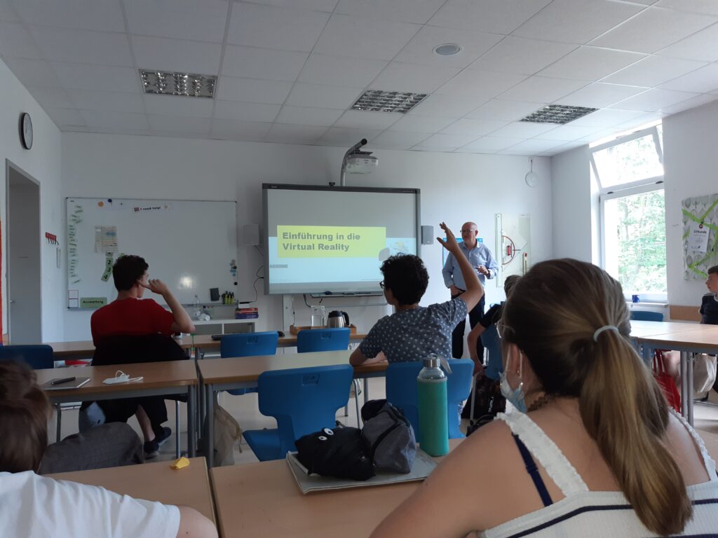Was ist Virtual Reality? Was steckt hinter dem Begriff „On Boarding“? Am Dienstag, dem 06.07.2021 besuchte Dipl.-Ing. H. Schwarz (TERTIA-Gruppe) den Wahlpflichtkurs moderne Medien, der Klassenstufe 8, um den aktuellen Stand der VR-Technik vorzustellen. Es wurde in einem interessanten Theorieteil die Funktionsweise, ökonomische Hintergründe des Produktes und vor allem die Möglichkeiten VR-Technik in kollaborativer Weise in Projektarbeit oder Unterrichtsgestaltung einzubinden, erklärt und aufgezeigt.