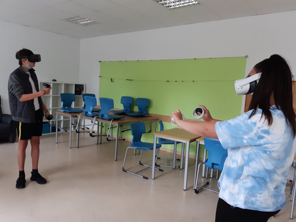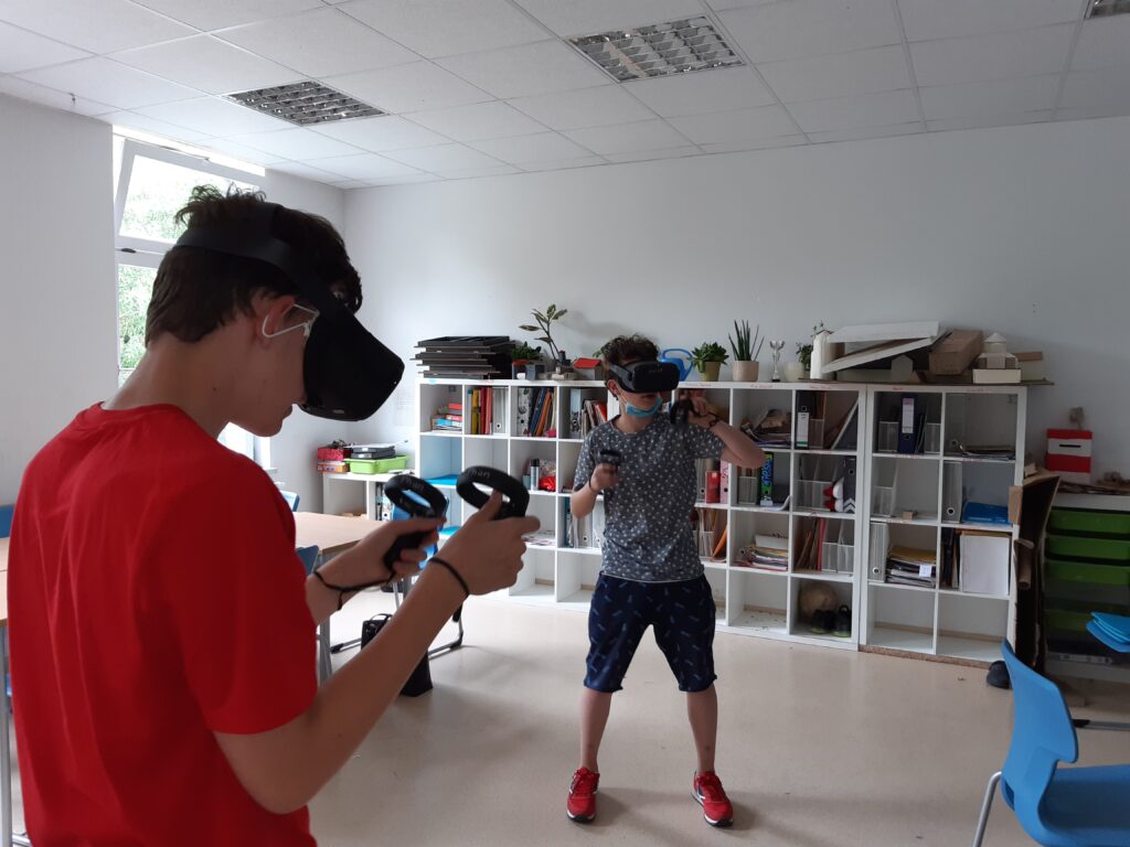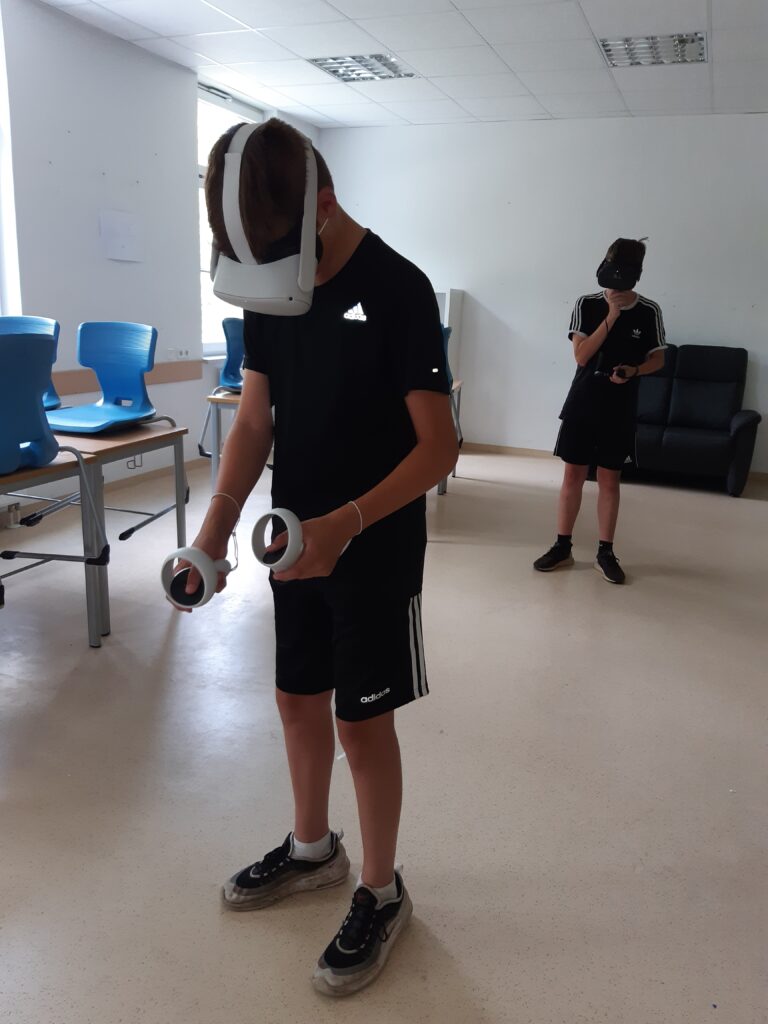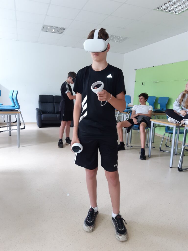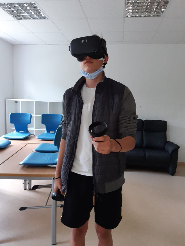 Im Praxisteil des Projektes konnten sich die Schüler*innen selbst mit der Technik – VR-Brillen der Marke Oculus Quest – auseinandersetzen. Der Einstieg ging mit Hilfe durch Herrn Schwarz schnell und alle Schüler*innen erprobten sich in einer virtuellen Spielewelt, um erste Erfahrungen zu sammeln oder Vergleiche anzustellen. (Text/Fotos: J. Reiche)