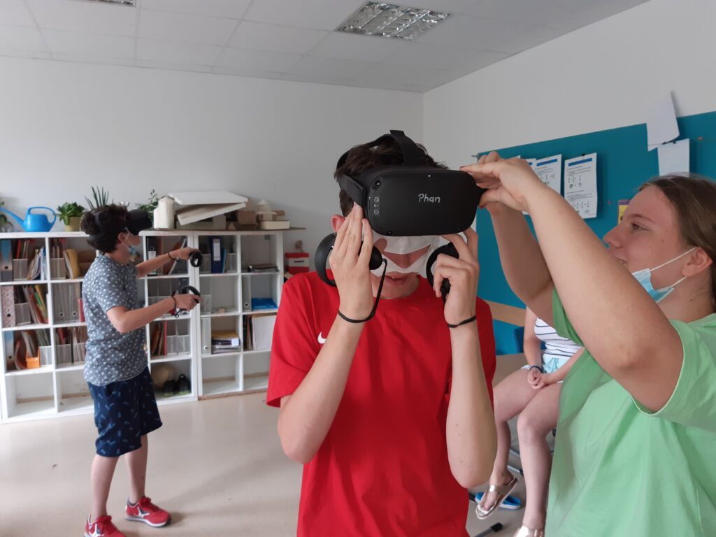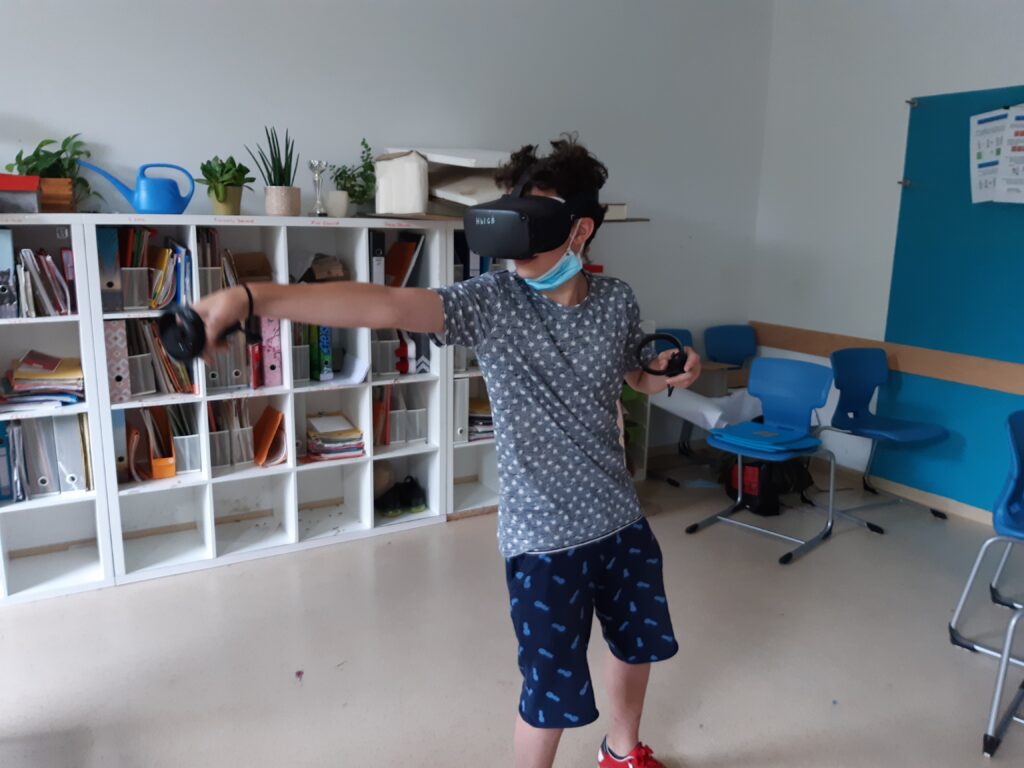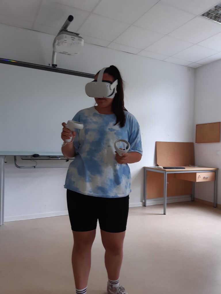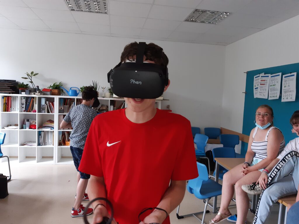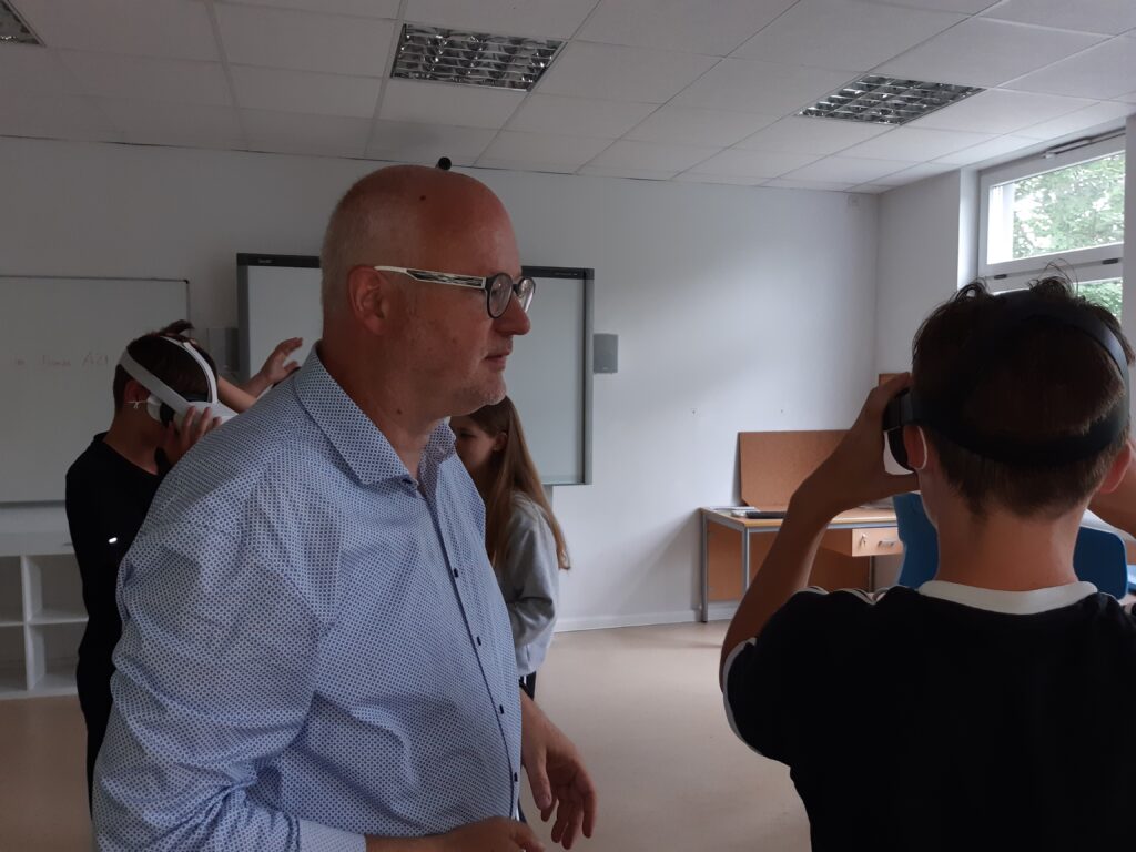 Im Praxisteil des Projektes konnten sich die Schüler*innen selbst mit der Technik – VR-Brillen der Marke Oculus Quest – auseinandersetzen. Der Einstieg ging mit Hilfe durch Herrn Schwarz schnell und alle Schüler*innen erprobten sich in einer virtuellen Spielewelt, um erste Erfahrungen zu sammeln oder Vergleiche anzustellen. (Text/Fotos: J. Reiche)